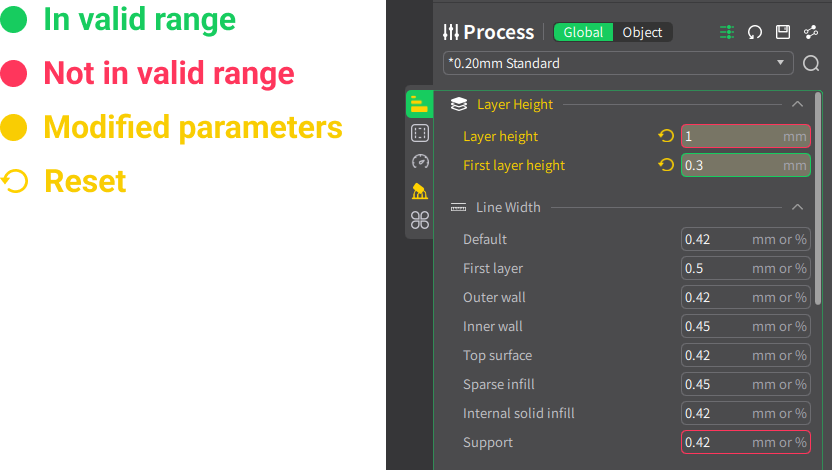 - Evidently, the valid range of parameters is closely associated with various factors such as the types of consumables and the device model. This often makes it challenging for users to accurately judge the validity of settings. To address this issue, we have established a suitable range for each parameter and provided a color-coded input box. This allows users to easily determine the status of parameters while making changes.