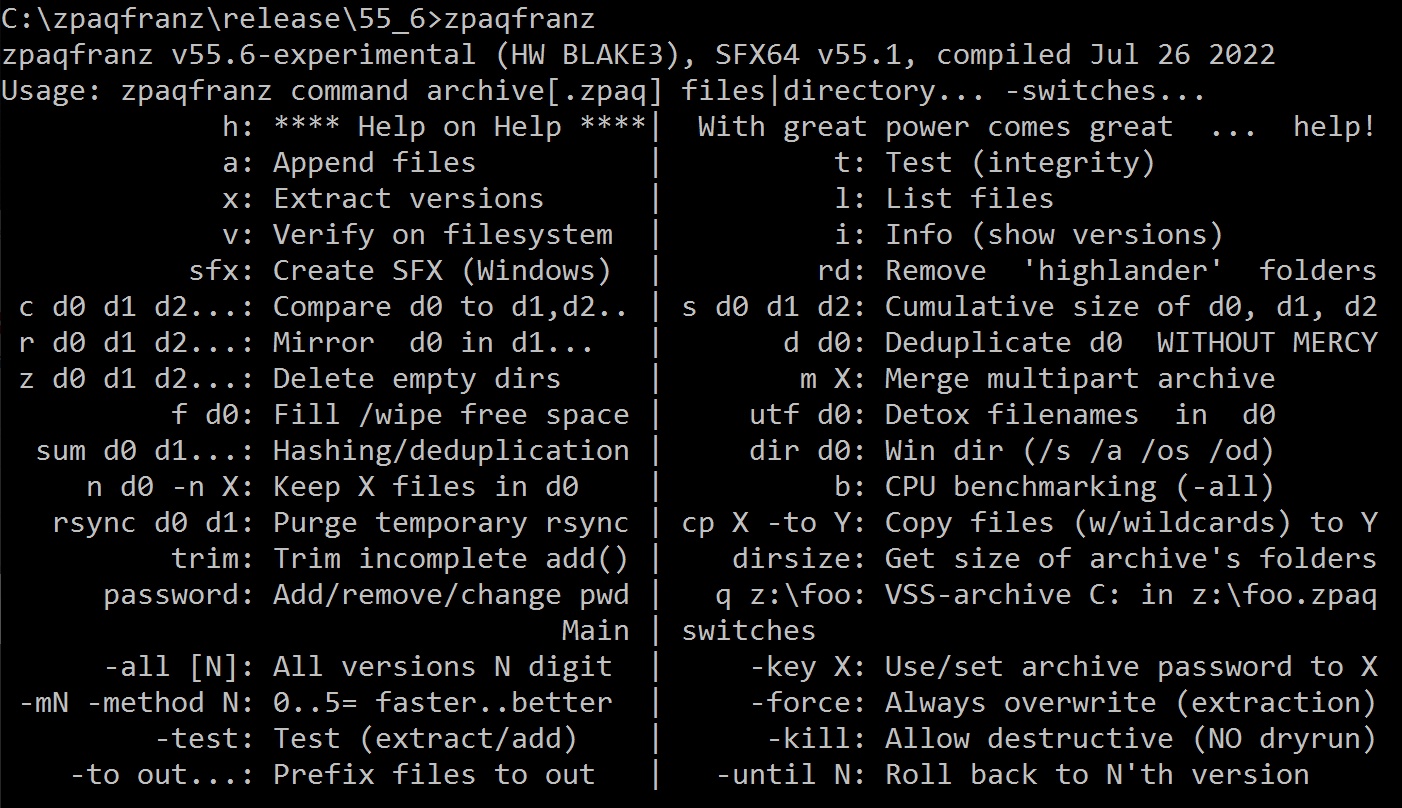 The "help on help" (can be asked by zpaqfranz /? zpaqfranz h zpaqfranz -h etc) is more concise, but more readable