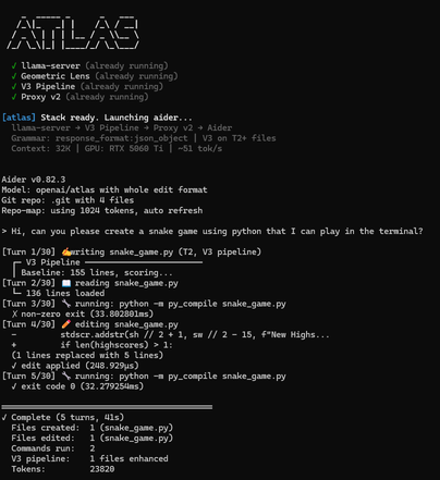 atlascommand — starts all services and drops you into an Aider-powered coding session- Grammar-constrained agent loop — the model emits structured JSON tool calls (