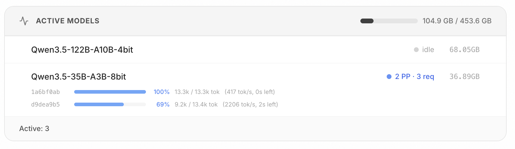 - Real-time prefill progress tracking in the dashboard. See all loaded models, per-request prefill progress bars with speed and ETA, memory usage, and active/waiting request counts at a glance.