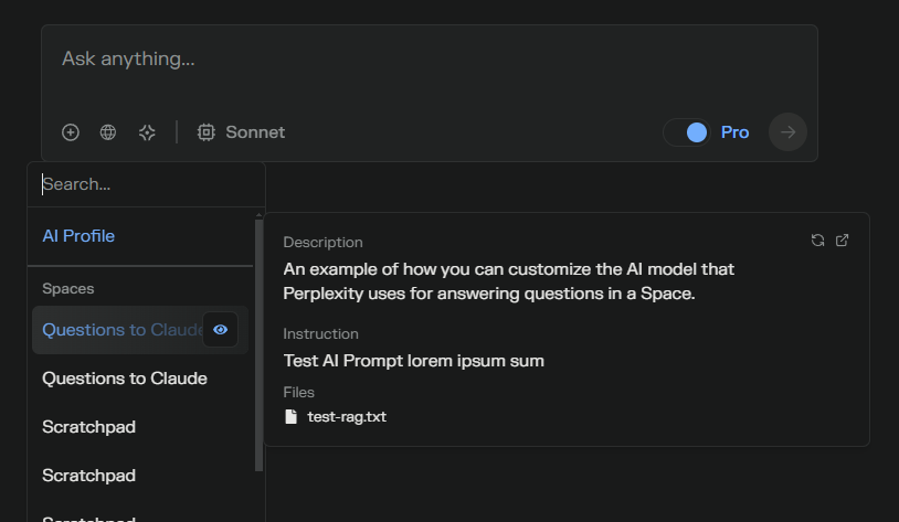 - NOTE: Files search only works when Pro Search is enabled. Complexity automatically turns on Pro Search when you select a space that has at least 1 file uploaded.