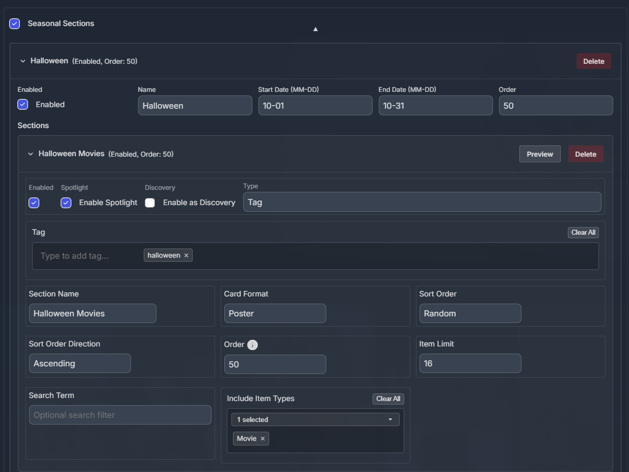 - Home Screen sections are fully customizable including Name, Order, SortOrder, ItemLimit, CardFormat, etc.