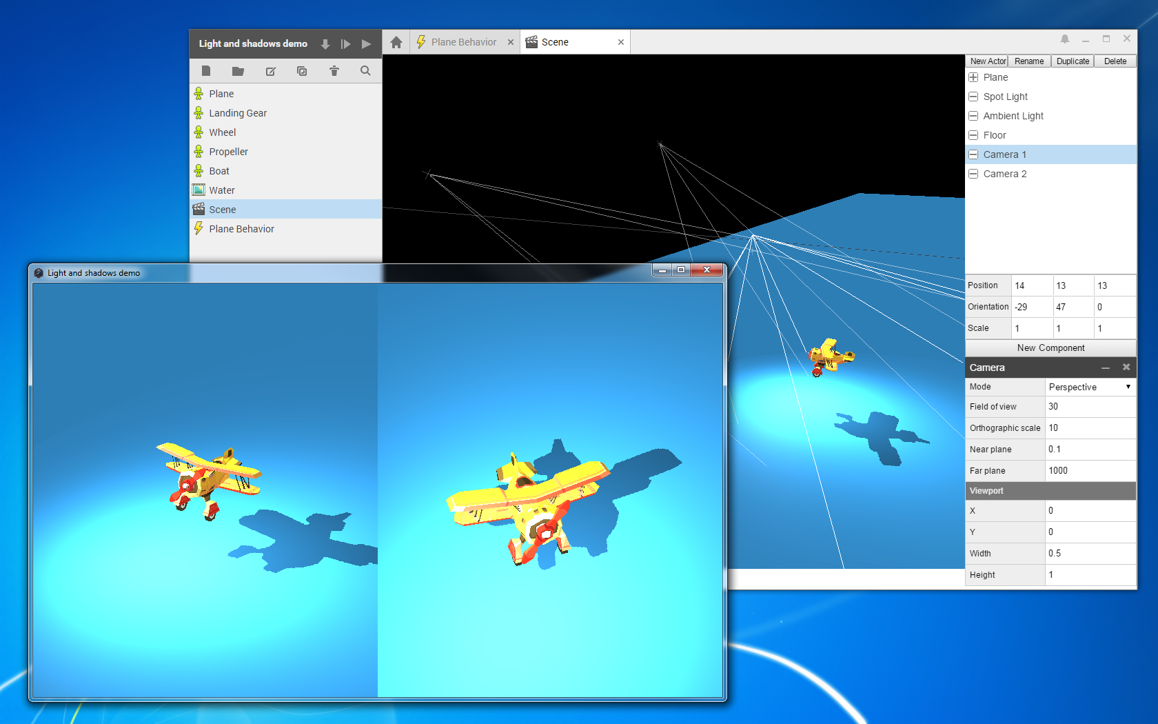The light plugin adds ambient, directional, spot, point lights and shadow casting. Sprite and model renderers now let you choose between basic and phong materials.